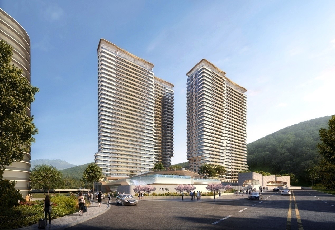位于廣東省深圳市龍崗區(qū),設(shè)計(jì)理念源自海濱卵石和流動(dòng)的水紋,結(jié)合山海自 然美感與舒適人居,以迭砌手法創(chuàng)造建筑 形體,取之自然而禮贊自然。立面設(shè)計(jì)利 用外墻欄板作出柔和波浪,透過(guò)流線襯托 高尚不喧的建筑氣質(zhì),主體以淺色系和香 檳金相互映襯,賦予個(gè)性鮮明的外表。幕 墻面積 30000 ㎡,建筑高度 107.2m,幕墻 形式有鋁板幕墻、石材幕墻等。